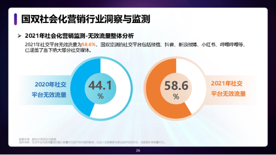 根据报告统计,2021年微博、抖音、快手、B站、小红书等主要社交平台无效流量达到58.6%。